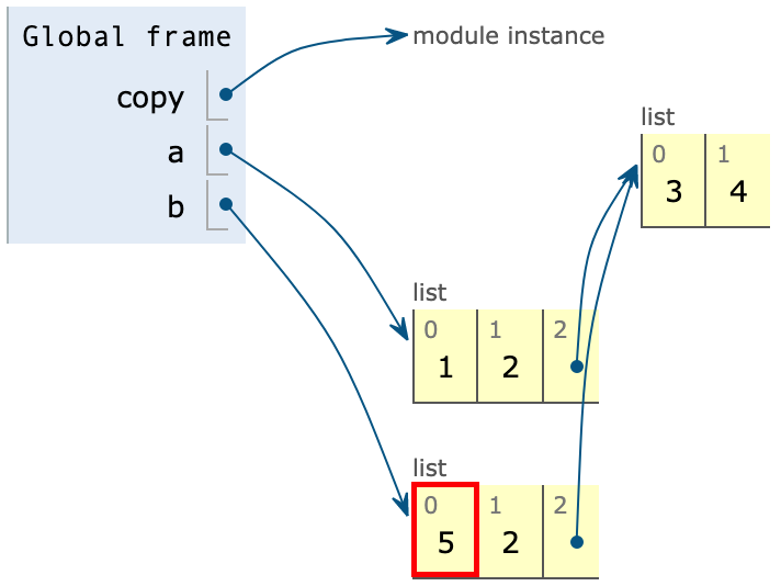 하지만 리스트안의 리스트인 [3, 4]는 할당했을 때처럼 같은 리스트를 갖게 된다.