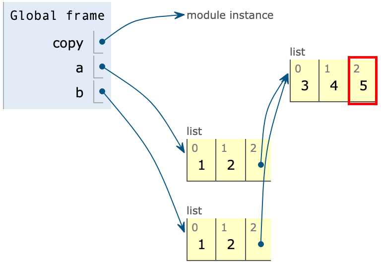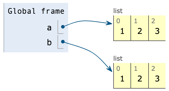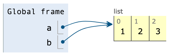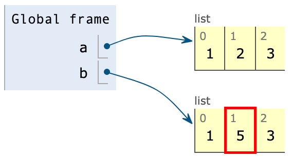 b[1] = 5 print(a) -> [1, 5, 3] print(b) -> [1, 5, 3]