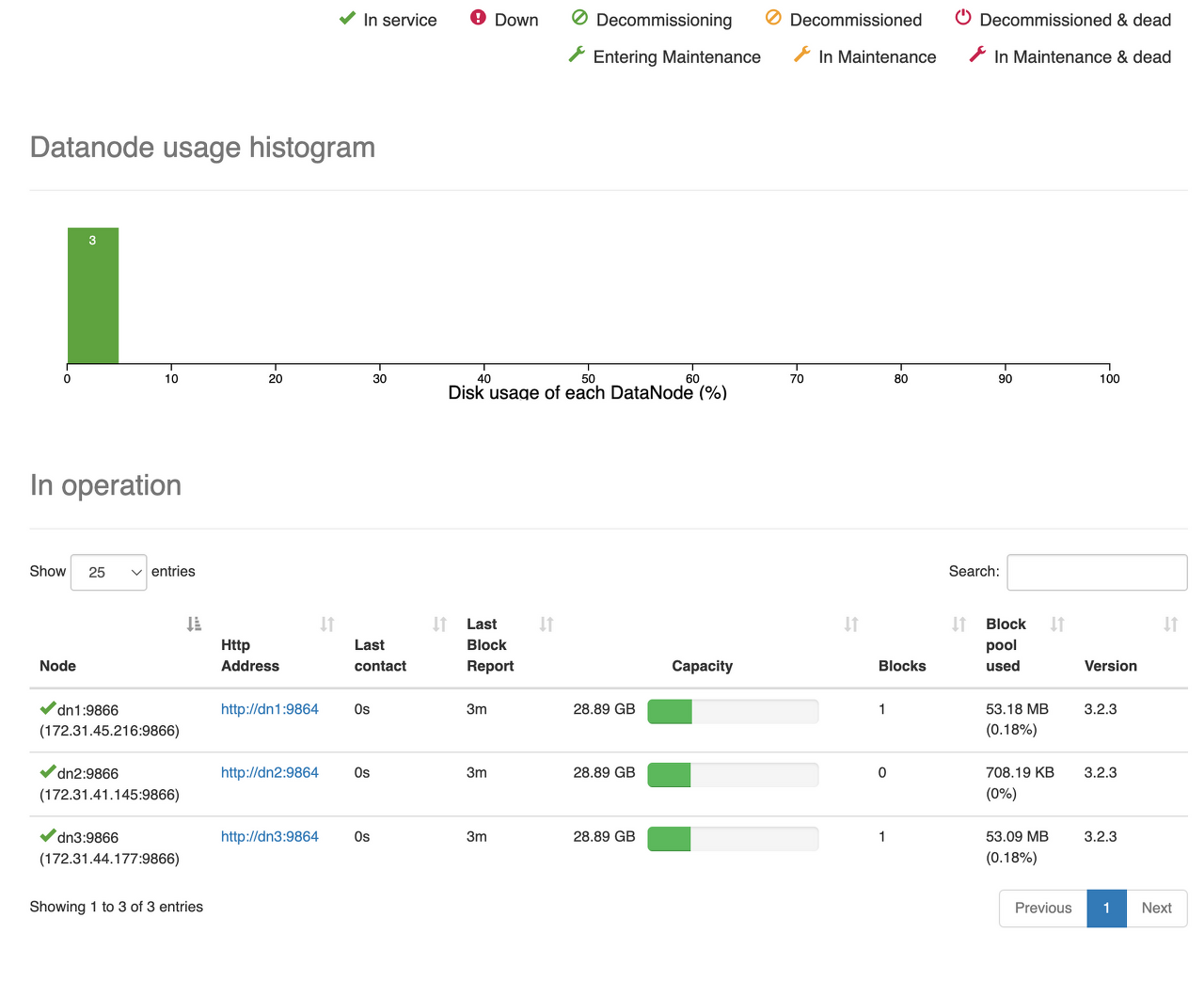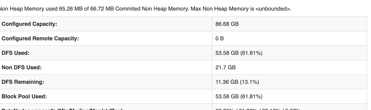 HDFS 가용 공간은 (30GB*3) 총 90GB 로 현재 프로젝트를 진행하는데 문제없는 용량이었다.